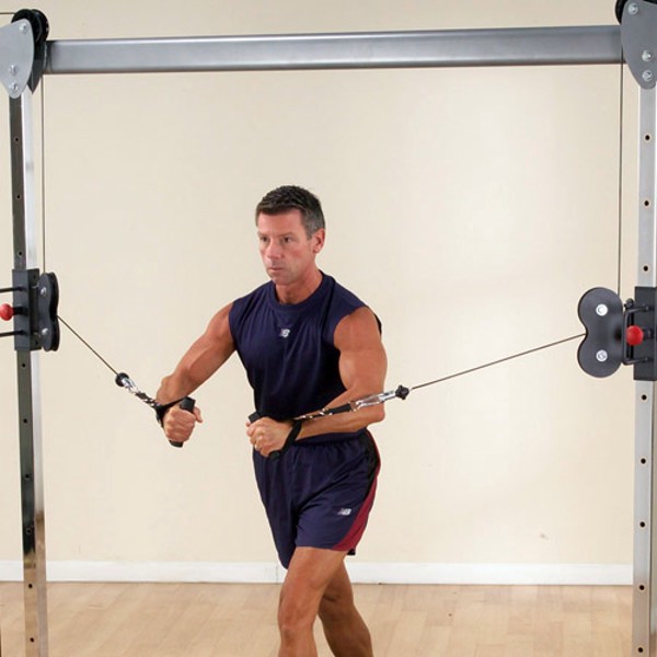 Make all the right moves for the ultimate workout! Body-Solid takes state-of-the-art crossover stations to new heights with the Selectorized Deluxe Cable Crossover, a dynamic addition to any home gym exercise program. Sturdy and stable, the new design lets you exercise virtually every major muscle group in your body. Interchangeable cable handles provide an unlimited number of possibilities for all experience levels, and the extra wide and tall mainframe provides you with easy access to an endless array of high and low pulley exercises The Selectorized Deluxe Cable Crossover’s unique pull-up station offers multiple grip positions, and dual independent carriages have been ergonomically designed to offer twice as many height adjustments as previous Body-Solid crossover stations. With 20 independent height adjustments and 180