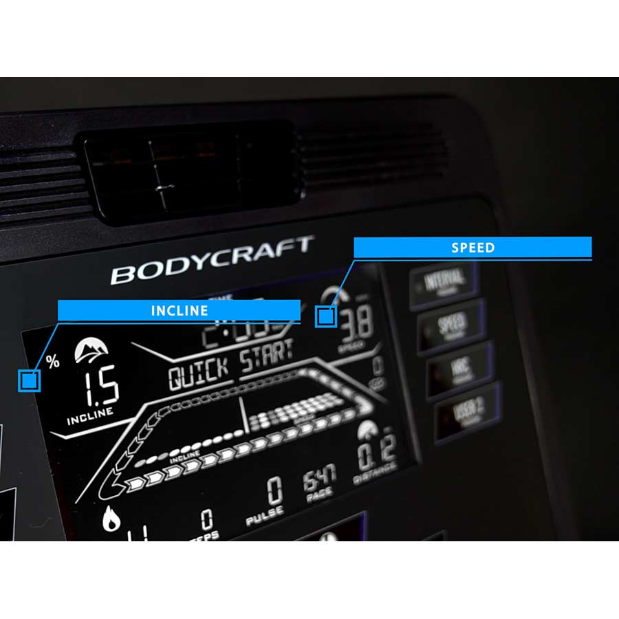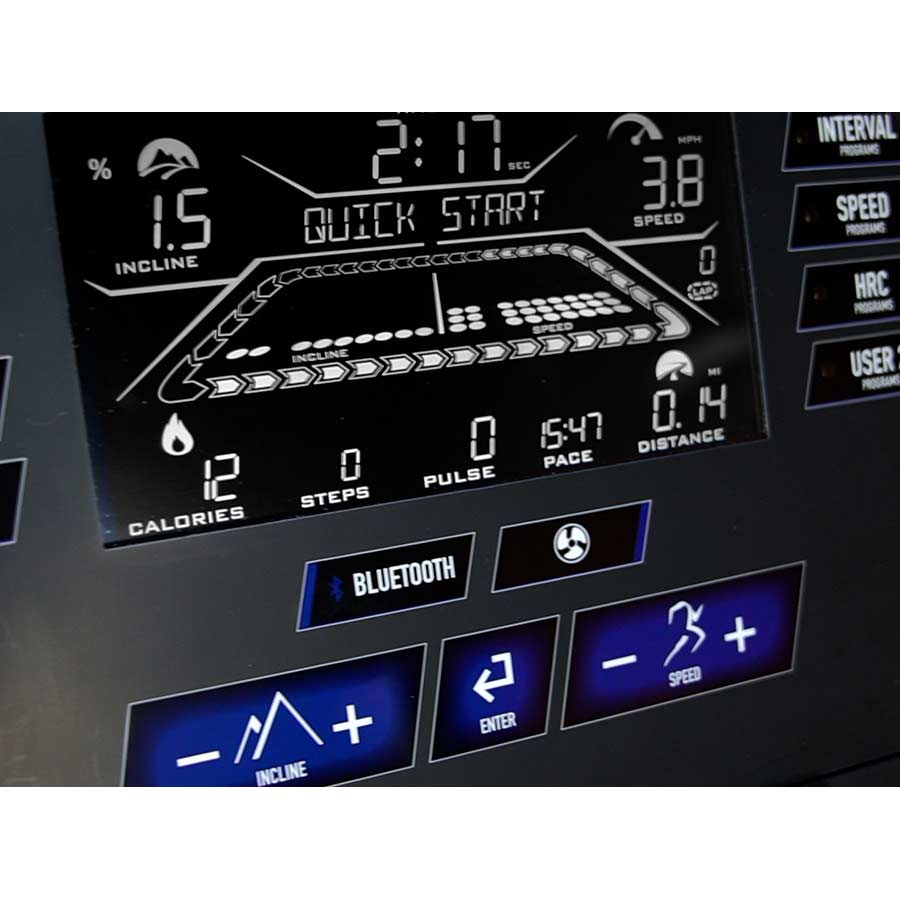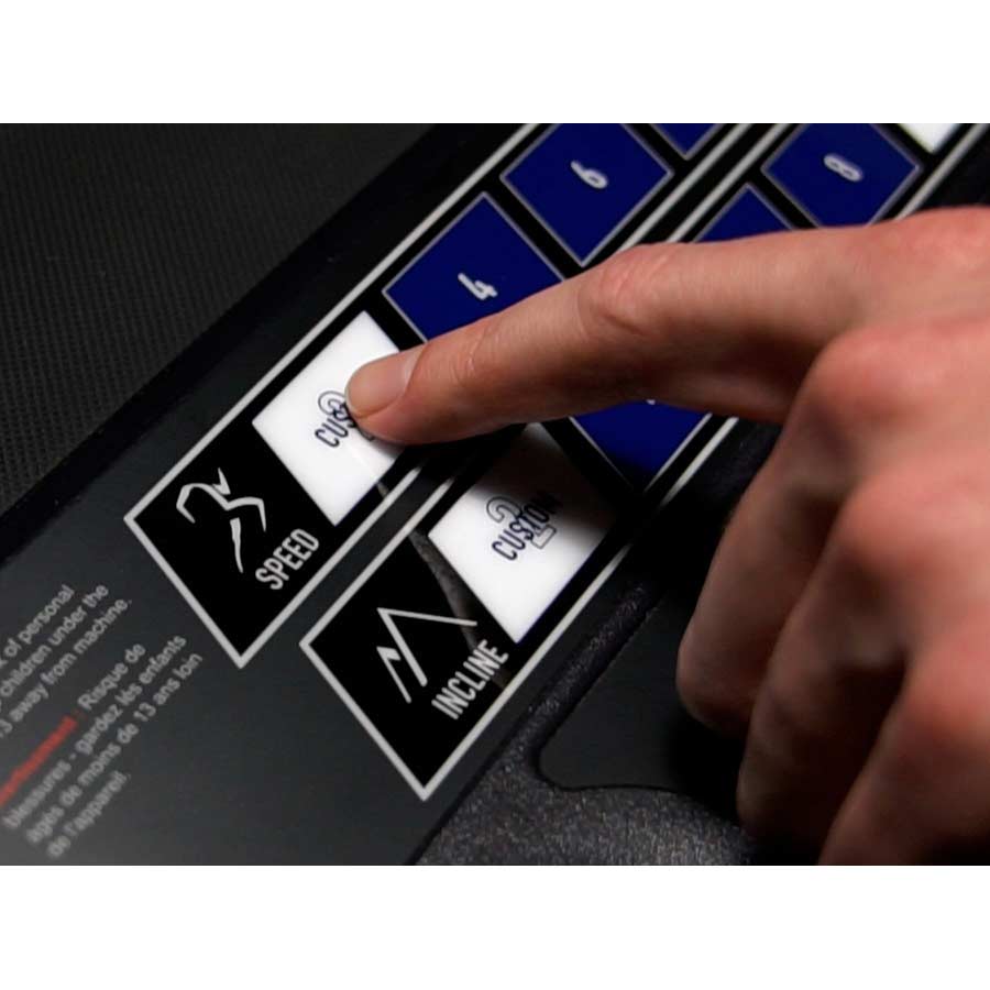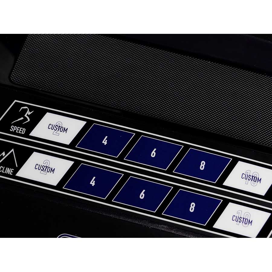 The lower console is equipped with quick keys for speed and incline. Both the speed and incline set have 2 custom settings each. Set your preferred custom speeds with .1mph increments and custom incline at 1% increments. Create your own manual interval training or simply set your perfect walking / running speeds.