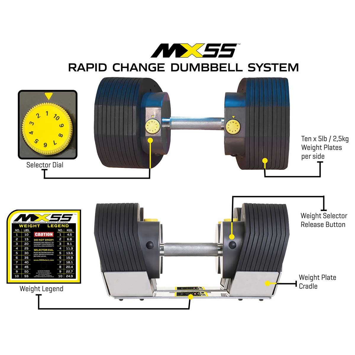 Safe, convenient, accurate and space efficient, the MX55 Rapid Change Dumbbell System is a perfect addition to any home workout area.