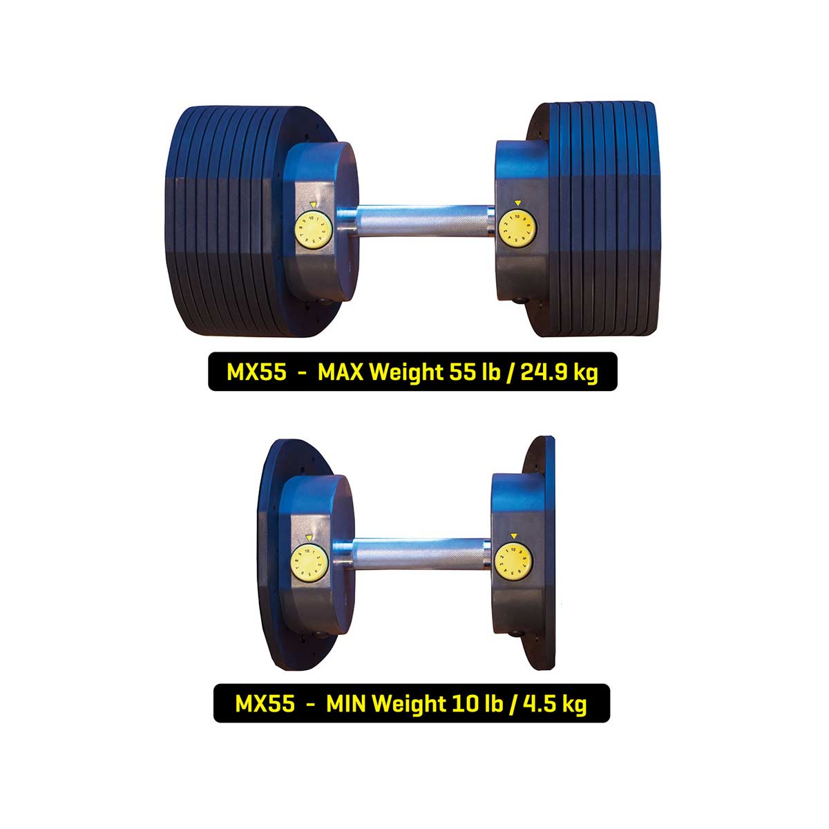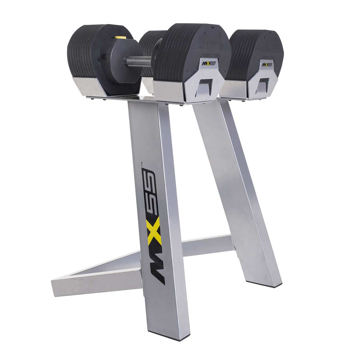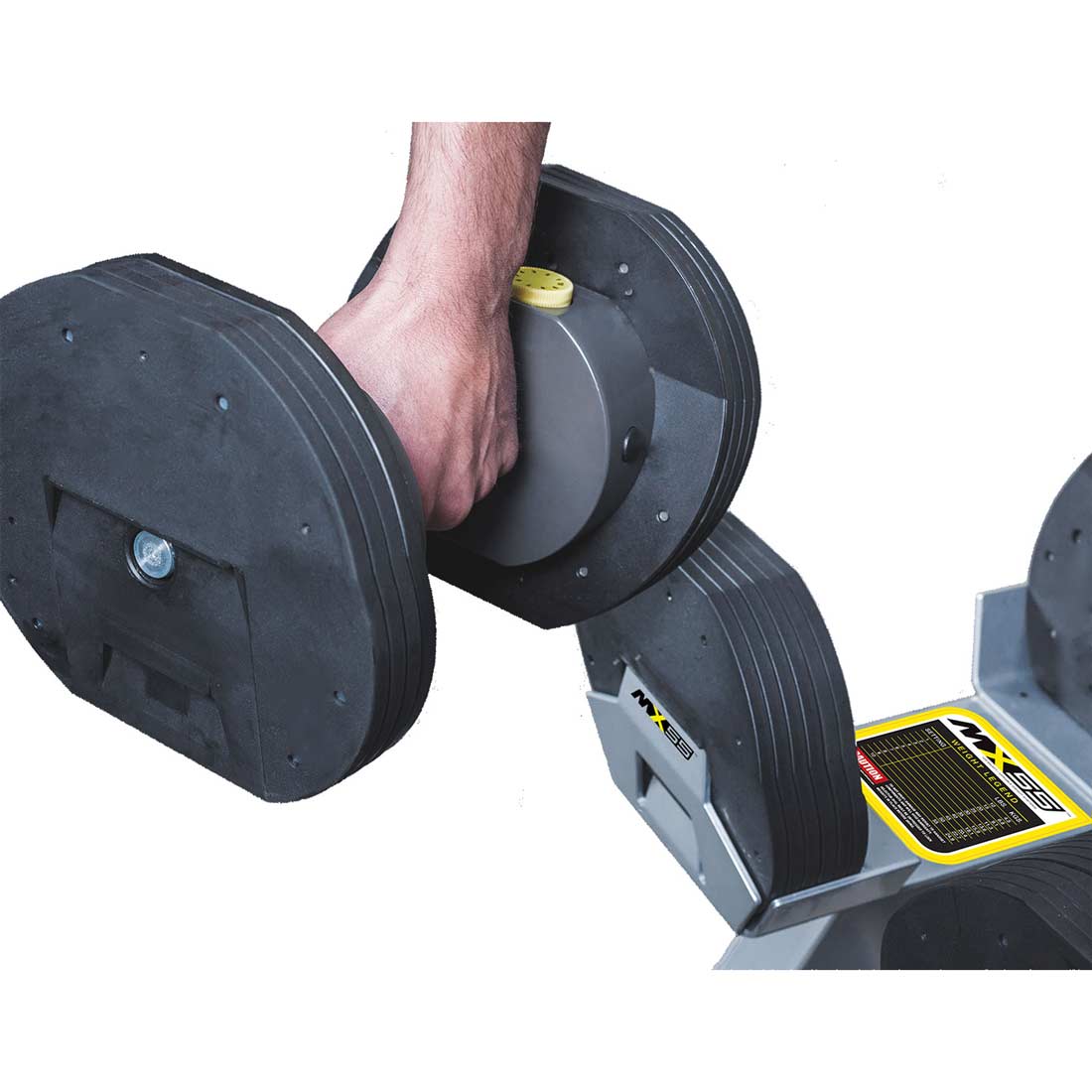 One pair of MX55 Dumbbells replaces a 10-piece dumbbell set and a cumbersome rack. The MX55 Rapid Change Dumbbell System includes a sleek rack (rack included) is space efficient and easy to use, perfect for any in-home fitness room.