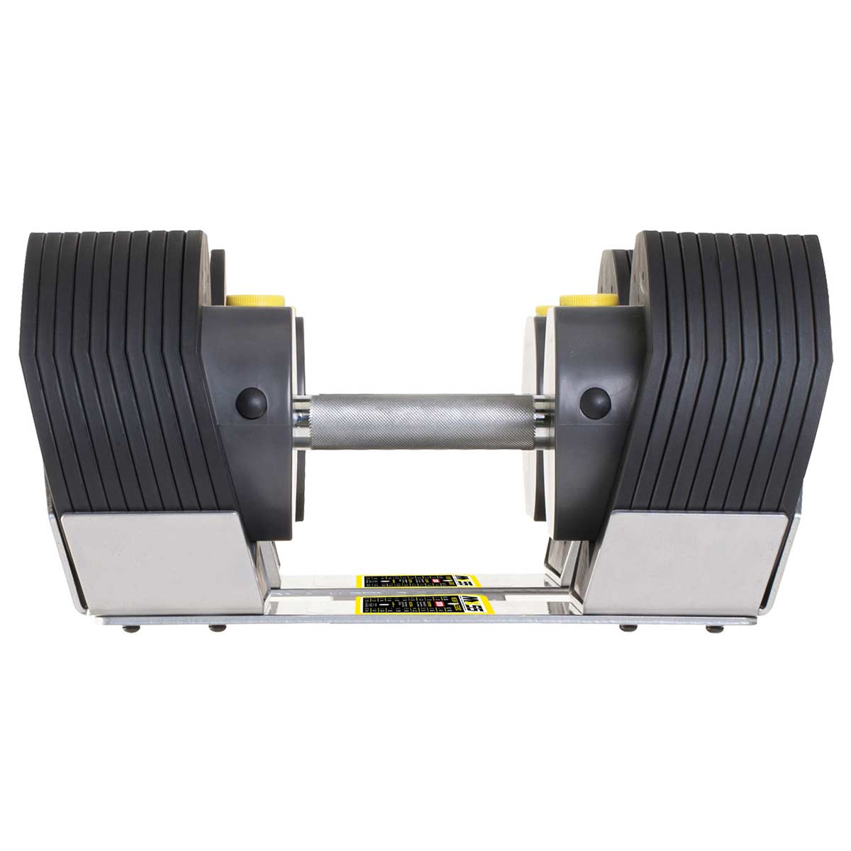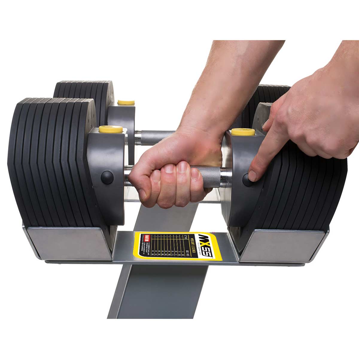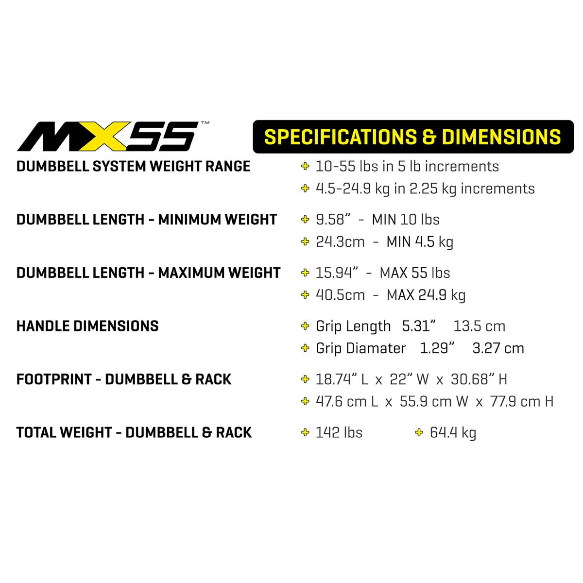 One pair of MX55 Dumbbells replaces a 10-piece dumbbell set and a cumbersome rack. The MX55 Rapid Change Dumbbell System includes a sleek rack (rack included) is space efficient and easy to use, perfect for any in-home fitness room.