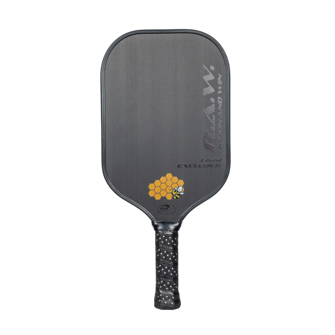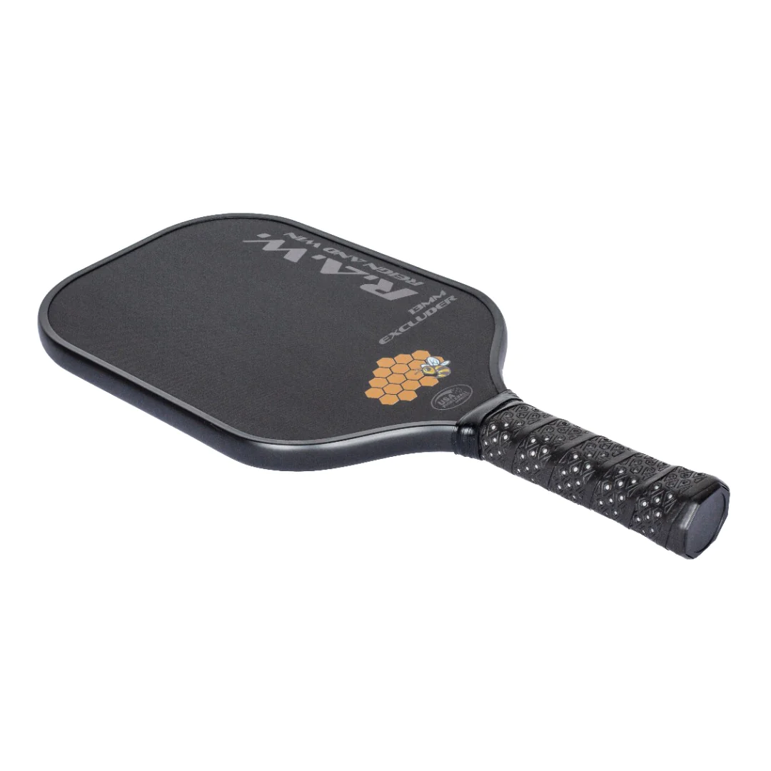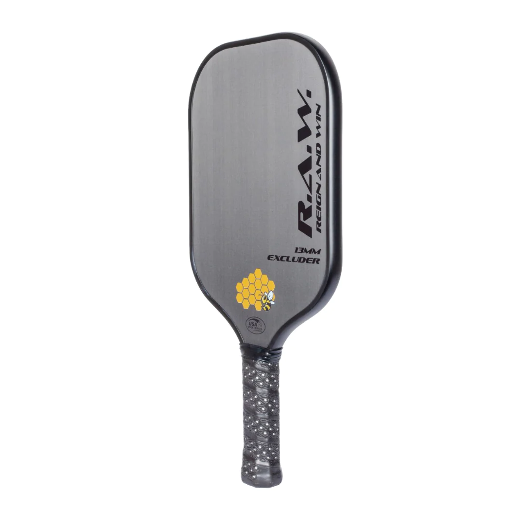 FEATURES A RAW T700 CARBON FIBER FACE WITH A POLYPROPYLENE HONEYCOMB CORE, AND 13MM THICKNESS FOR THOSE WHO LOVE POWER. THIS PADDLE PRODUCES AMAZING AMOUNTS OF SPIN, WITH A HUGE SWEET SPOT. IT HAS A BALANCE OF MASSIVE POWER AND CONTROL WHEN NEEDED. THE T700 RAW CARBON FIBER PROVIDES YOU MAXIMUM SPIN AND GRIT WHILE REMAINING COMPLIANT UNDER USA PICKLEBALL GUIDELINES. THE EXCLUDER WEIGHS AN AVERAGE OF 8.1 OUNCES FOR GREAT DURABILITY. WITH A SOLID TORAY T700 SURFACE IT IS PERFECT FOR ANY SHOT REQUIRING POP, AND SPIN.